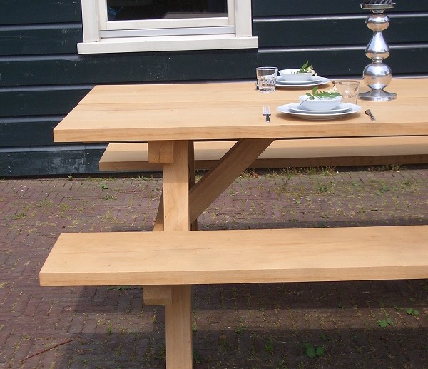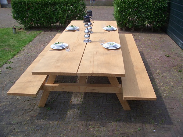 Oerdegelijke eiken picknicktafel voor 8/10 personen.